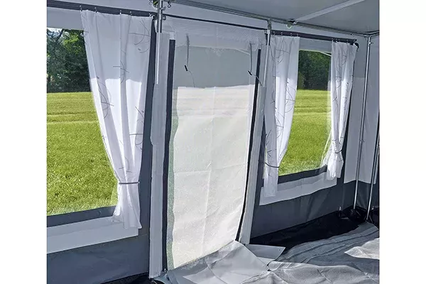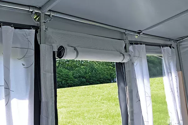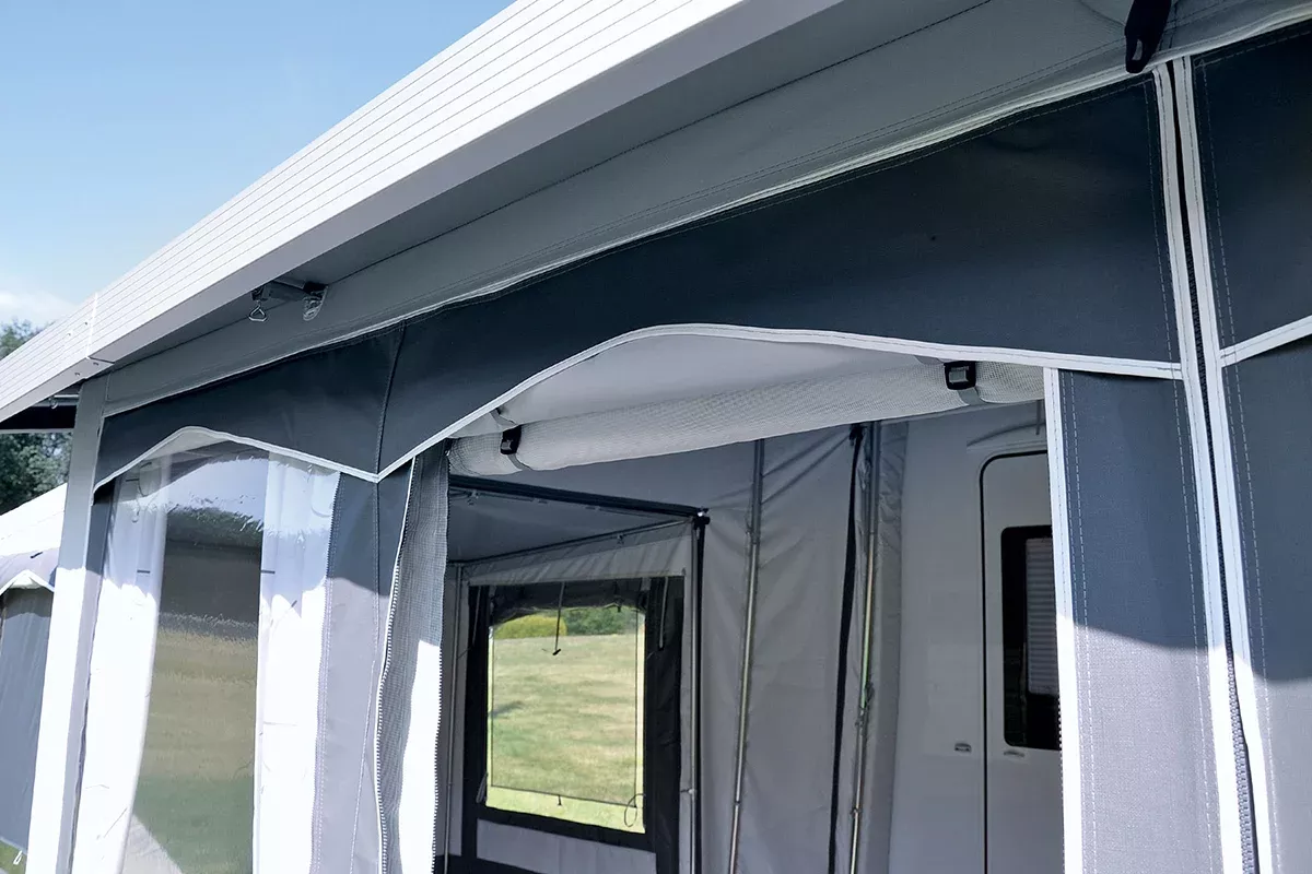 • Sie wird in die hoch- oder seitlich weggerollte Eingangstür Ihres Vorzeltes eingesetzt